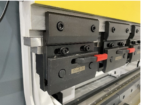 Upínací systém „evropského typu“ (Amada-Promecam) pro horní nástroj. Horní mezikusy s pracovní výškou 100 mm a ručním rychloupínáním s horizontální výměnou nástroje. Upínací systém „evropského typu“ (Amada-Promecam) pro matrice se základnou 60 mm
